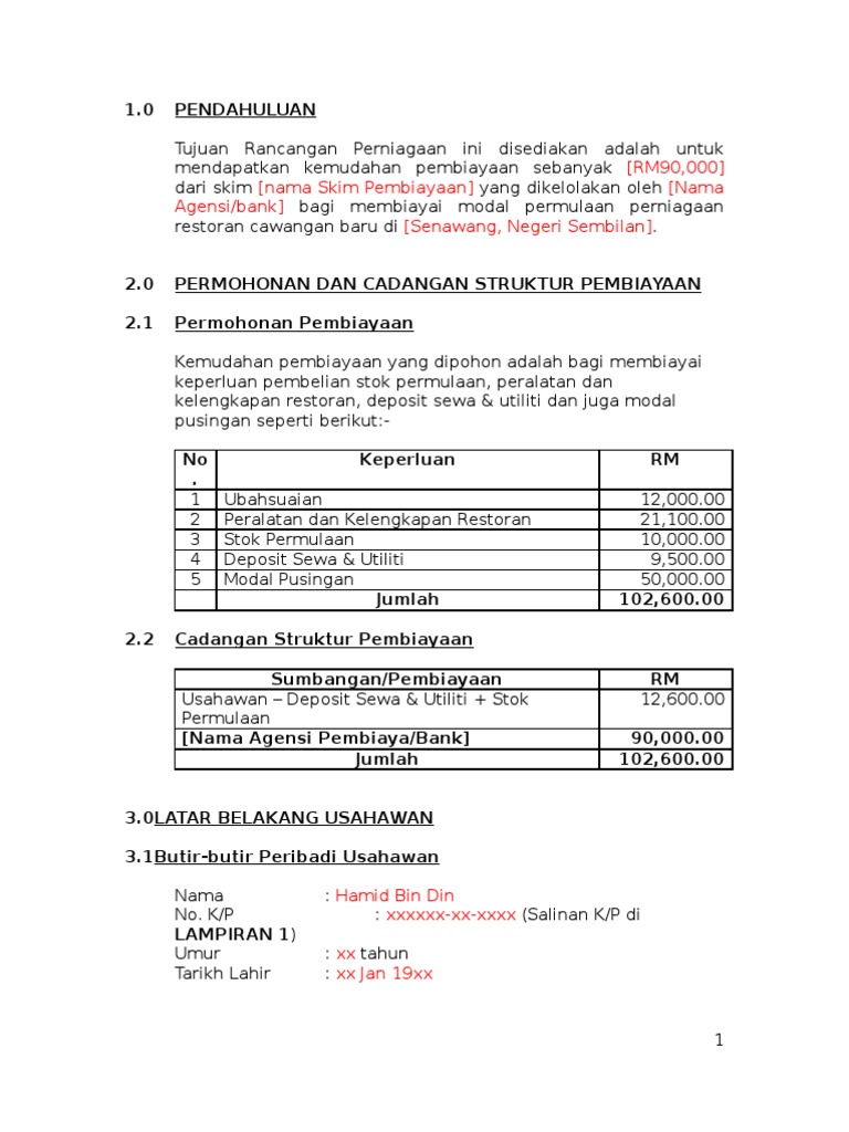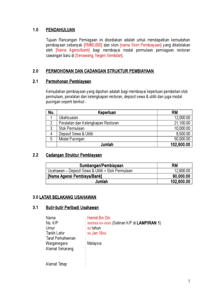 Tujuan rancangan perniagaan tujuan rancangan perniagaan ini disediakan adalah khusus pinjaman sebanyak rm 275,000 diperlukan dari tabung untuk makanan (3f) bagi menampung kos permulaan projek ini. Anda inginkan panduan kertas kerja perniagaan untuk memulakan perniagaan anda? Mereka ada masalah dalam menyediakan bahagian perakaunan dan pro forma untuk syarikat. Koleksi contoh kertas kerja atau rancangan perniagaan. Jadi saya syorkan anda dapatkan contoh kertas kerja perniagaan disini.