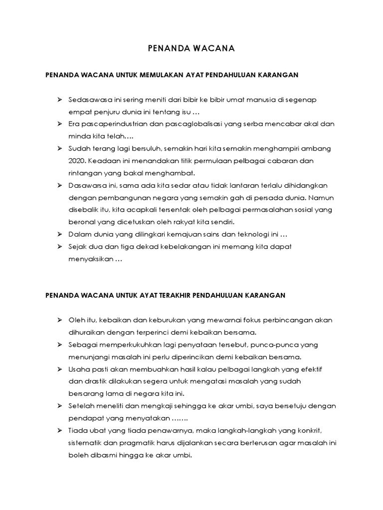 Penanda Wacana Untuk Karangan : Penanda wacana untuk isi :. Kepaduan dan kohesi akan muncul dari isi wacana. · sedasarwasa ini sering meniti dari bibir ke bibir umat manusia di segenap empat penjuru dunia ini tentang isu … · era pascaperindustrian dan pascaglobalisasi yang serba mencabar akal dan minda kita telah …. Related to penanda wacana untuk karangan. Penanda wacana untuk memulakan ayat pendahuluan karangan. Penanda wacana digunakan untuk menulis ringkasan dan pemahaman, karangan.
