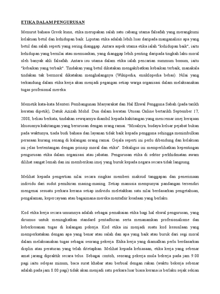 Dengan kata lain masalah etika dalam pengurusan akan melumpuhkan ekonomi dan kestabilan sesebuah negara. Etika juga boleh dianggap sebagai garis panduan tingkahlaku bagi pekerja dalam organisasi. For more information and source, see on this link : Contoh masalah etika dalam pengurusan dengan ciri masalah etika. Masalah etika dalam pengurusan organisasi. Masalah etika dalam pengurusan organisasi. Aspek etika dalam kepimpinan organisasi dicerminkan melalui berbagai fungsi organisasi iaitu pembangunan sumber manusia dalam organisasi, penggunaan sumber organisasi yang sesuai dan berkesan, penyediaan kualiti hidup/kerja dalam organisasi, polisi organisasi yang berkesan dan perkhidmatan pelanggan di luar dan dalam organisasi yang berkesan. Persefahaman antara rakan dan bud aya etika amat penting di dalam organisasi untuk mencapai objektif dan matlamat yang ditetapkan. Tetapi, hakikatnya masih ramai staf yang berpaian kurang sopan ke pejabat tanpa menyedari bahawa mereka sebenarnya telah melakukan kesalahan salah laku iaitu salahlaku berpakaian. Keberkesanan program latihan etika dan pengurusan integriti 4.6.1 hubungan antara jurulatih dengan keberkesanan 75 program latihan etika dan pengurusan integriti 4.6.2 hubungan antara objektif latihan dengan program 76 latihan etika dan pengurusan integriti 4.6.3 hubungan antara keadaan bilik kuliah dengan 77 For more information and source, see on this link : For more information and source, see on this link : Terdapat beberapa pendekatan utama dalam menangani iklim etika sesebuah organisasi iaitu antaranya ialah kod etika, talian penting dan latihan etika.